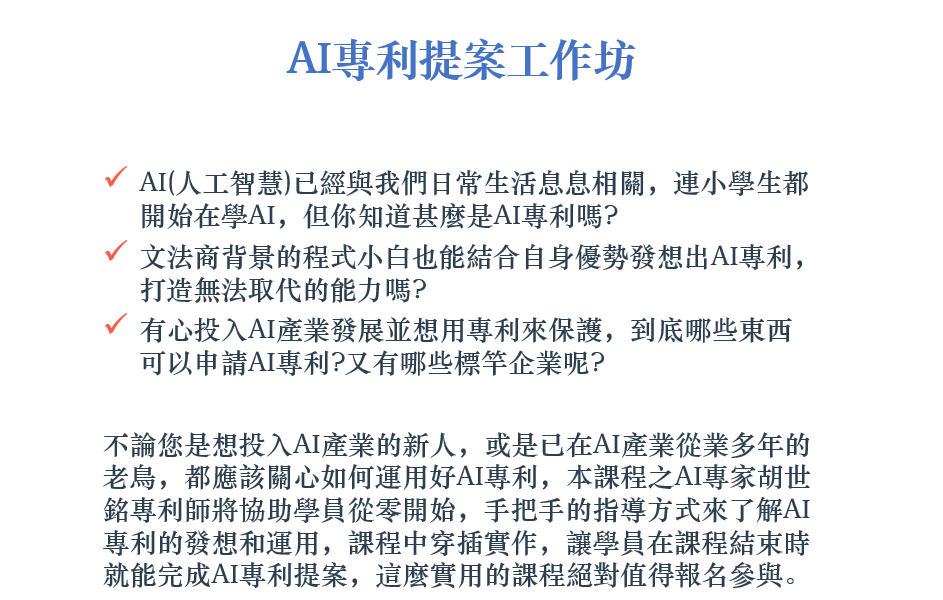 威聯通科技股份有限公司法務智權部專利師 基律科技智財有限公司專利師 北京國昊天誠智慧財産權代理有限公司專利代理師 威聯通科技內部教育訓練 AI Lighting Talk 擔任「勇闖(數位轉型 /AI)專利新世界」課程講師 勞動部勞動力發展署 AI 暨區塊鏈產業人才培訓計畫 擔任 「使用微軟認知服務搭建 AI 應用」 課程講師