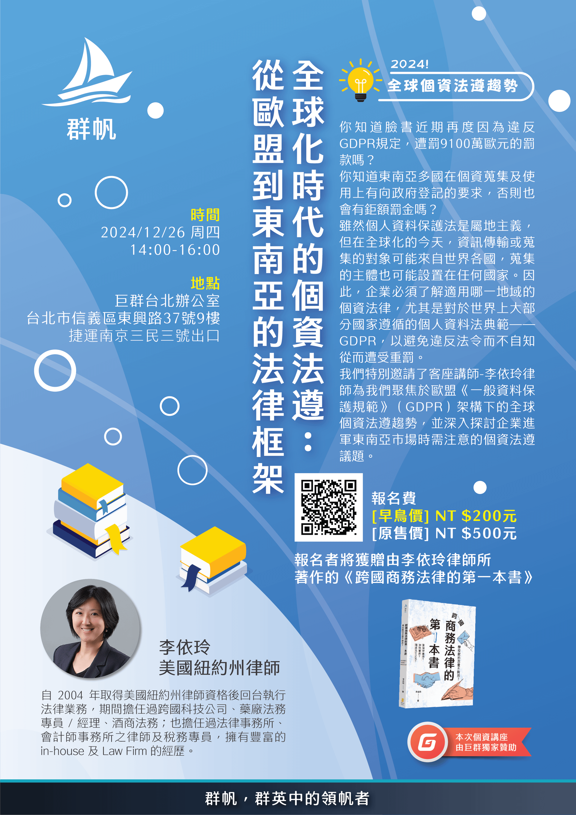 我們特別邀請了客座講師-李依玲律師為我們聚焦於歐盟《一般資料保護規範》(GDPR)架構下的全球個資法遵趨勢,並深入探討企業進軍東南亞市場時需注意的個資法遵議題。