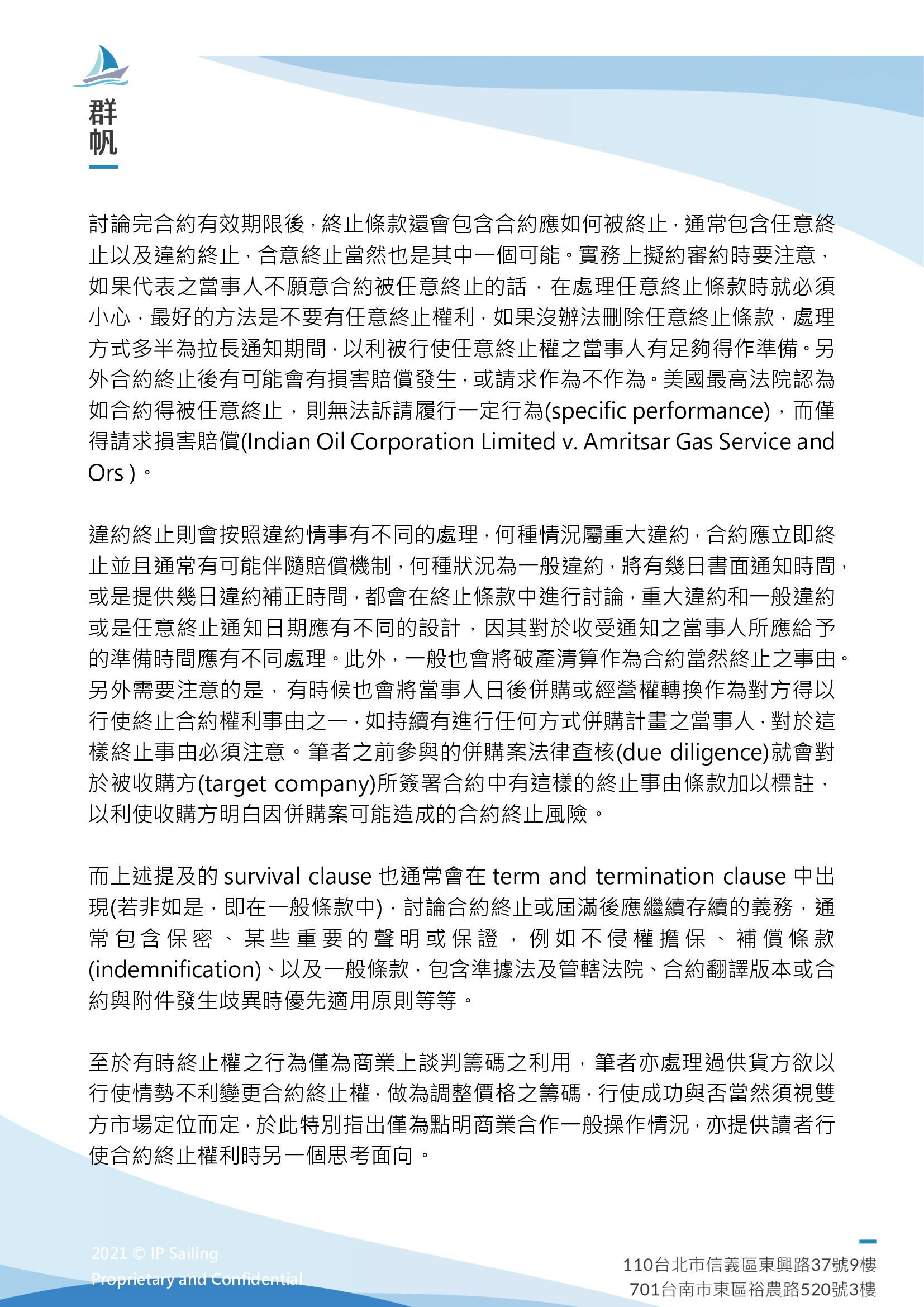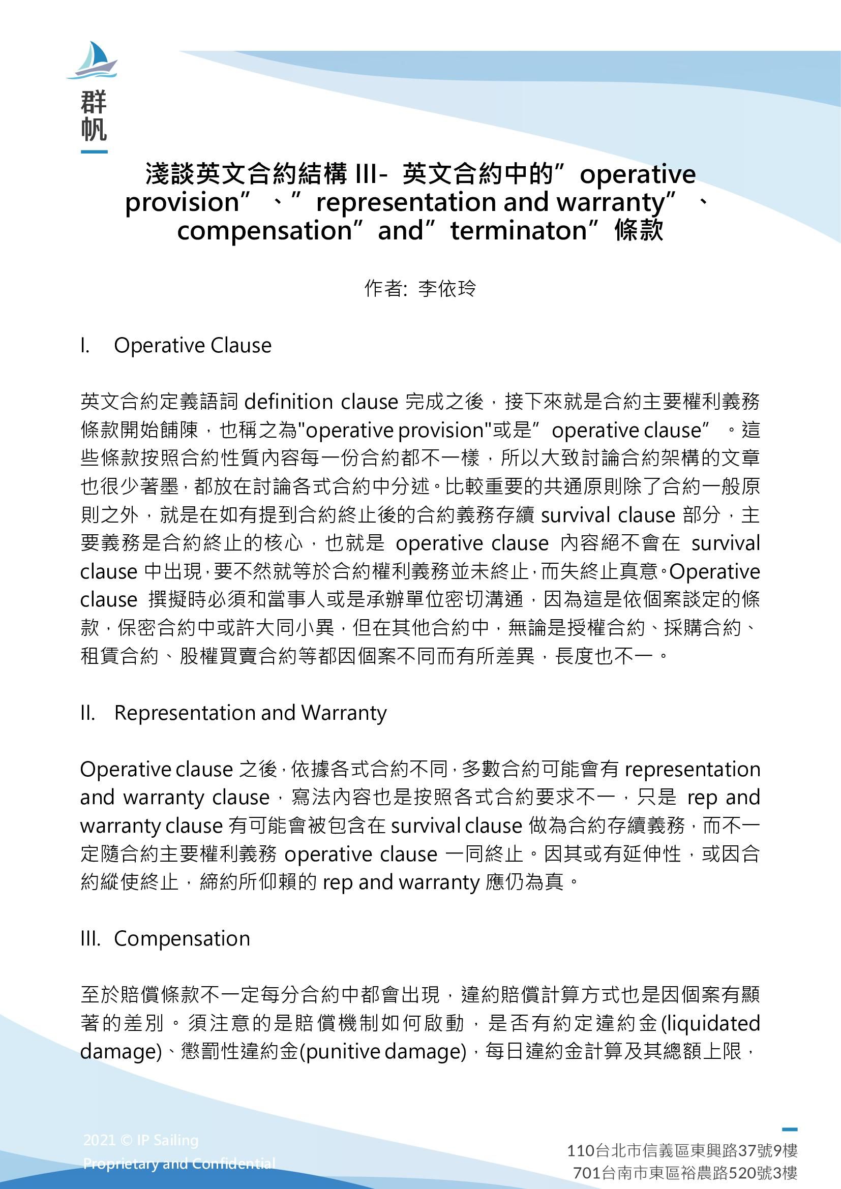 淺談英文合約結構III- 英文合約中的”operative provision”、”representation and warranty”、 compensation”and”terminaton”條款