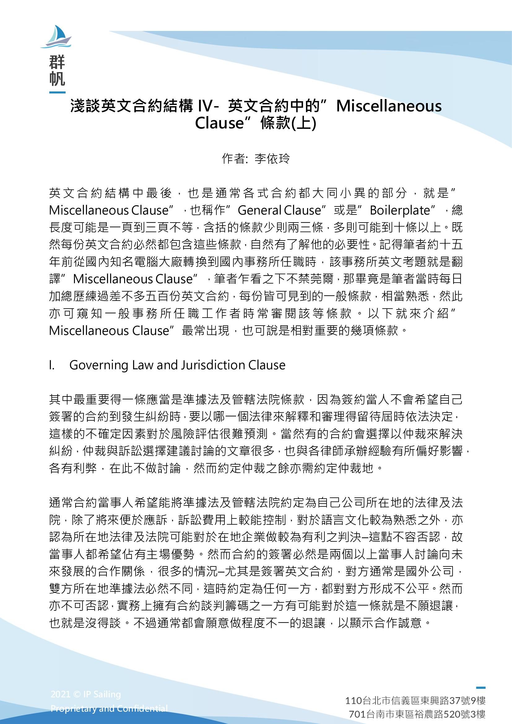 淺談英文合約結構IV- 英文合約中的”Miscellaneous Clause”條款(上)
