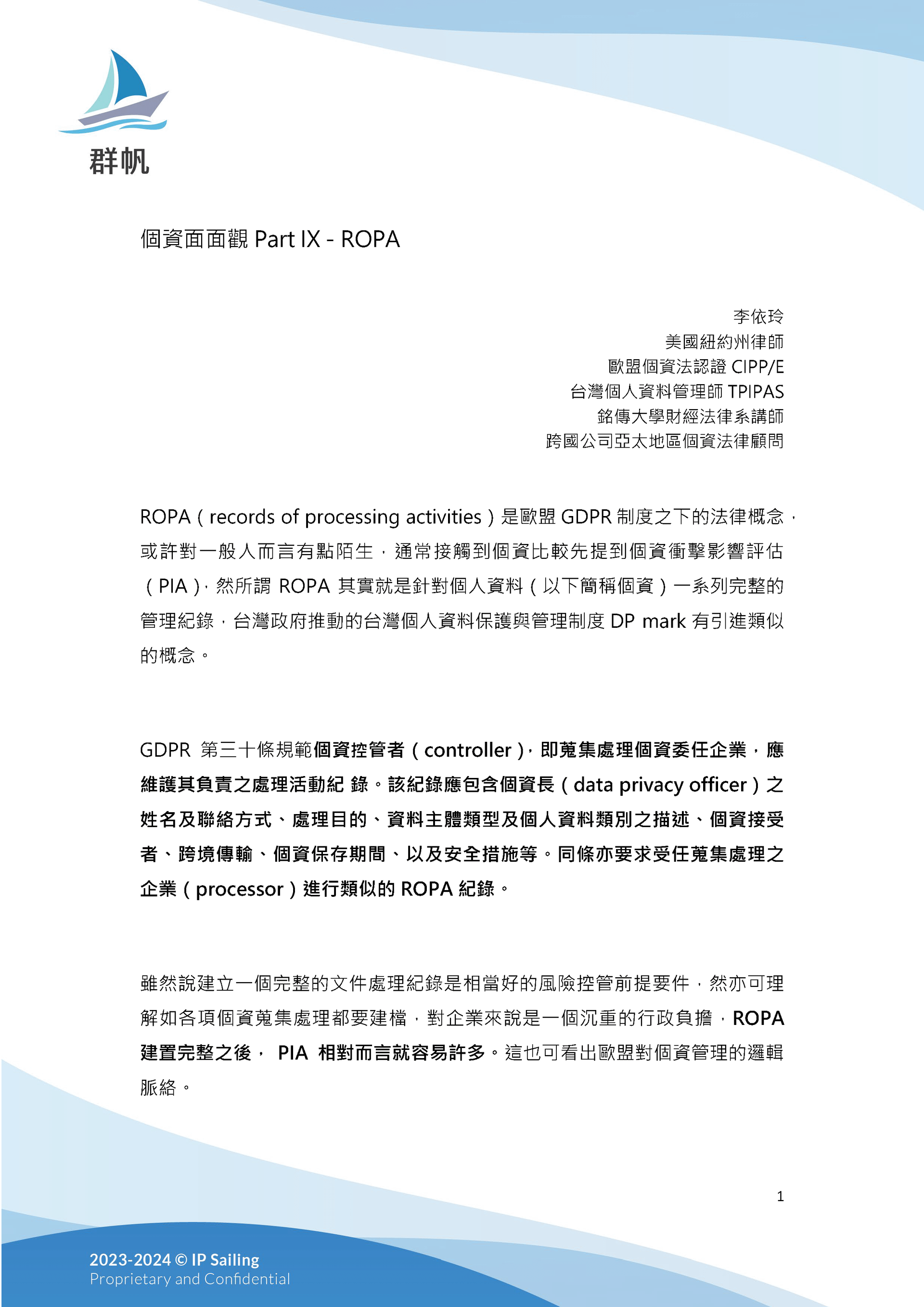 個資面面觀 Part IX:ROPA